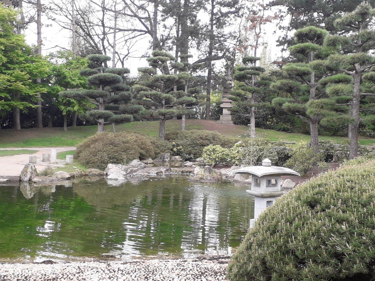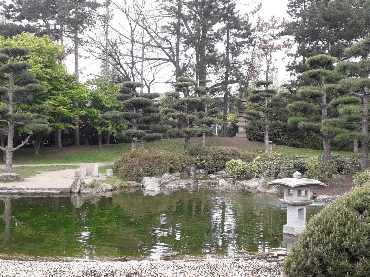 1975 kam der Japanische Garten hinzu, ein Geschenk der Japanischen Gemeinde als Zeichen besonderer Verbundenheit. Der Japanische Landschaftsarchitekt Iwakii Ishiguro und sein Sohn Shojiro verwirklichten vor Ort auf 5.000 Quadratmetern eine beeindruckende Anlage mit Wasserfall, Weiher, Felsen, Azaleen, Fächerahorn und in Form geschnittenen Kiefern. Alles in diesem Japanischen Garten am Rhein, auch „Garten der Besinnung“ genannt, hat eine tiefere symbolische Bedeutung, ob es sich um Bäume, Teich, Steine, Quelle, Hügel, Laternen oder die Sitzgruppe am Teich handelt.